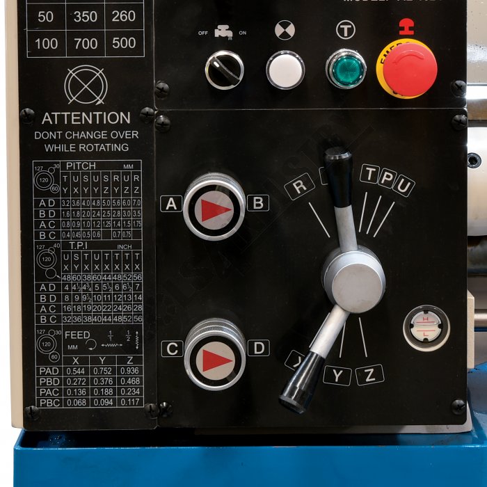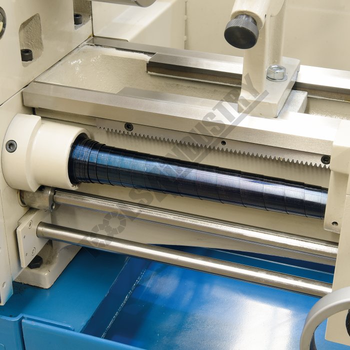 - Gear drive headstock for quick change of spindle speeds